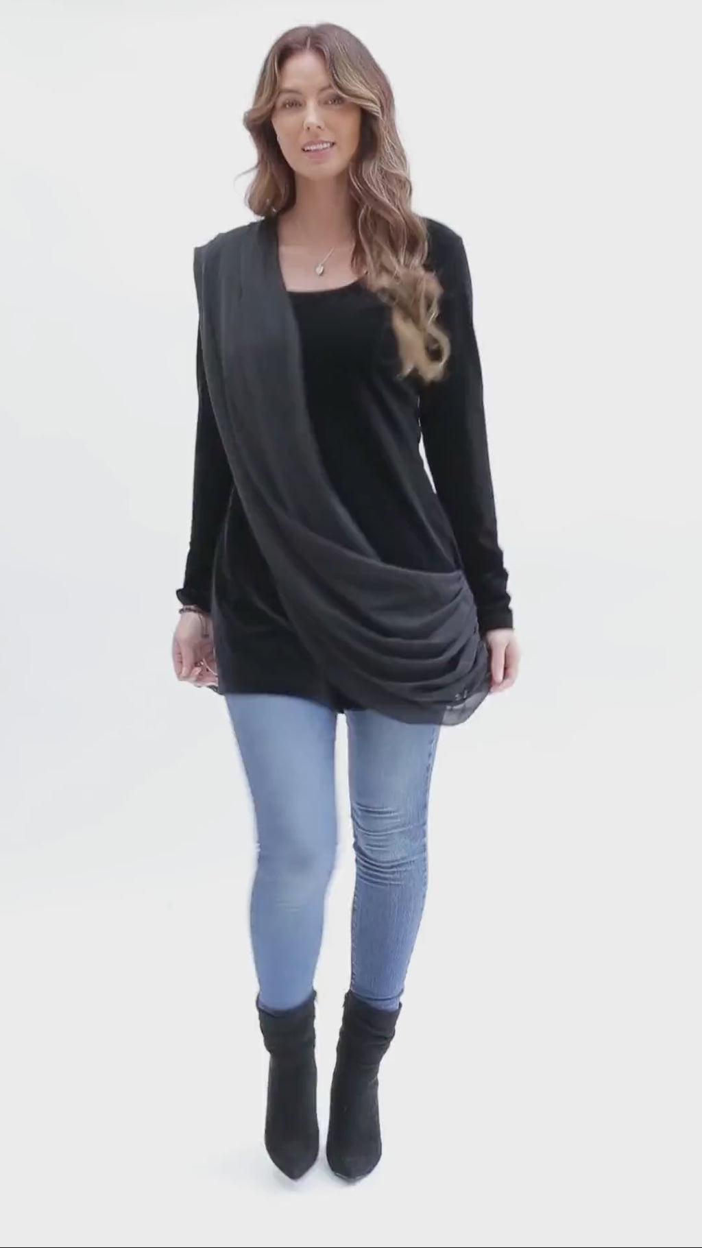 It combines a sleek velvet women's top with the elegant over-the-shoulder Saree-Scarf, creating a confident and feminine look at once.